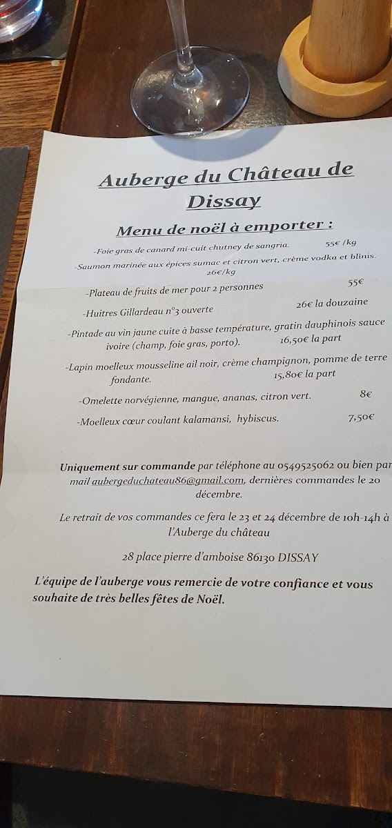 Auberge du Château, nestled in the charming heart of Dissay, France, offers a refined French dining experience that gracefully balances tradition and innovation. The menu, rich with homemade dishes, highlights fresh, quality ingredients crafted into flavors that are both comforting and subtly original. This is a place where the menu du jour shines—delightful daily specials that avoid the overly classic while steering clear of the too avant-garde, offering a perfect middle ground for those seeking genuine French cuisine with a creative touch.